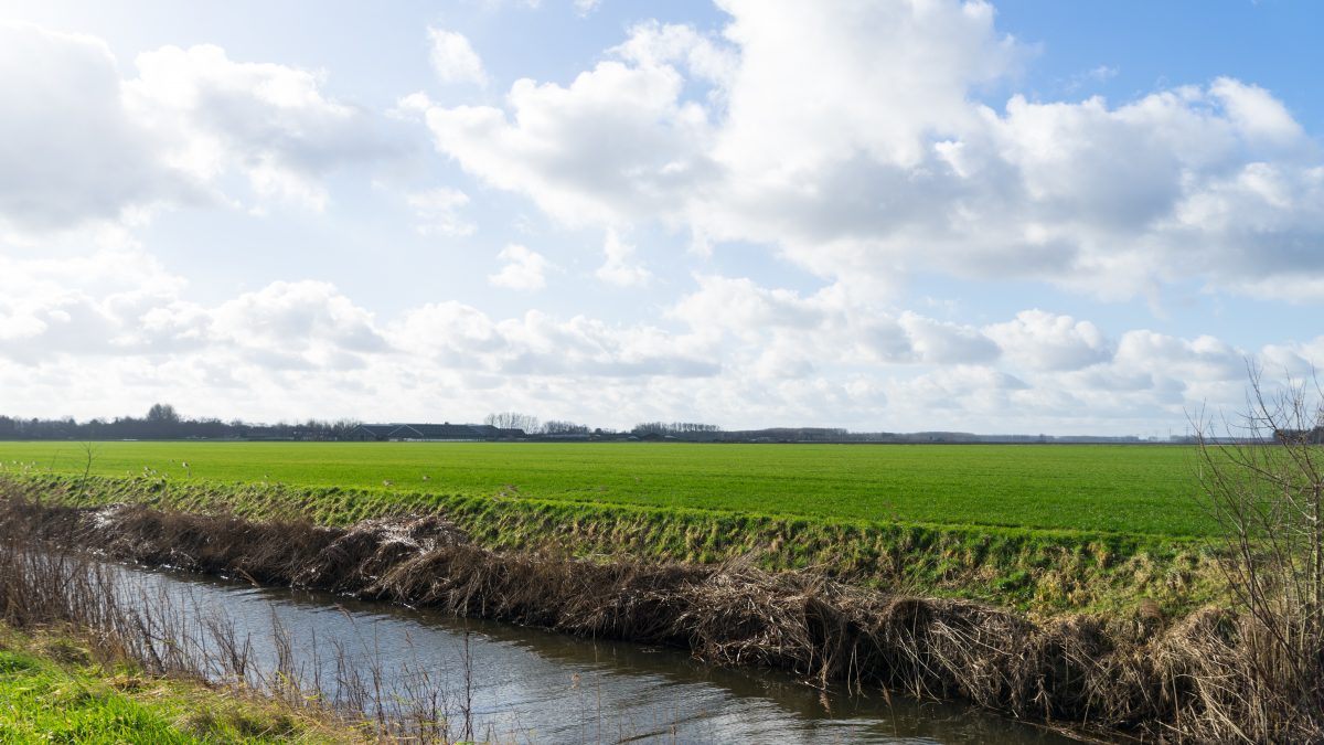 Bright colorful landscape with ditch. Cloudy sky over an endless field and meadow. Sunny day. Hulst, Zeeland, The Netherlands, Holland